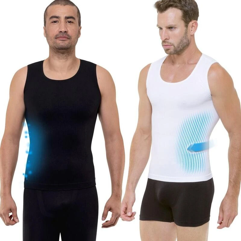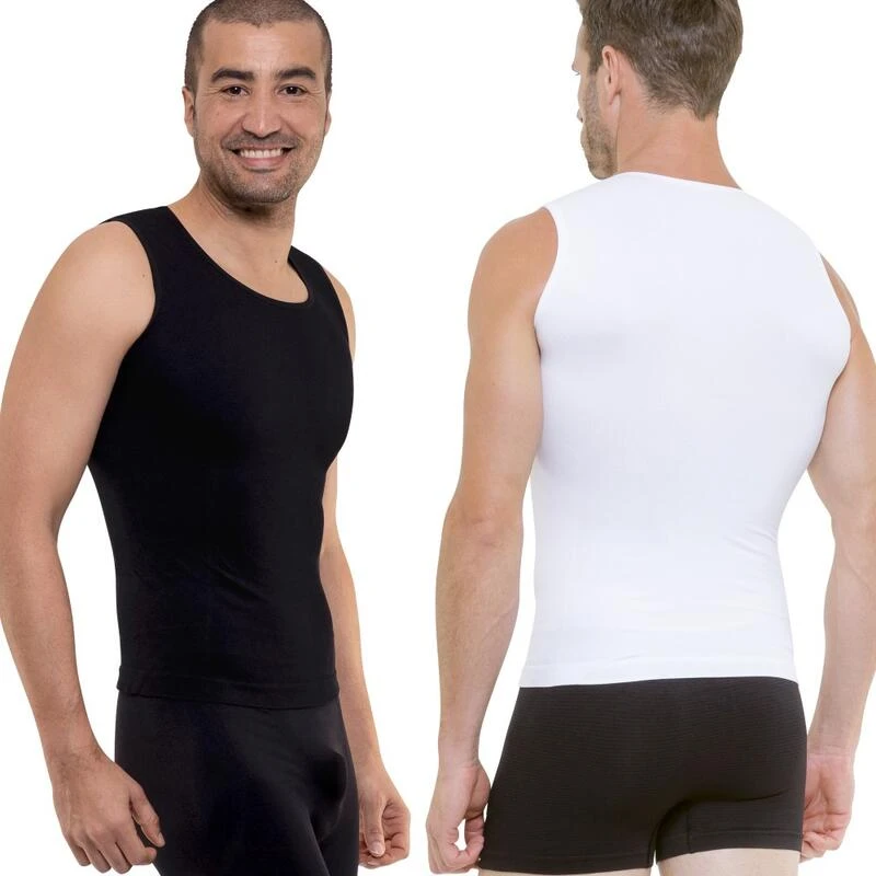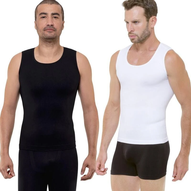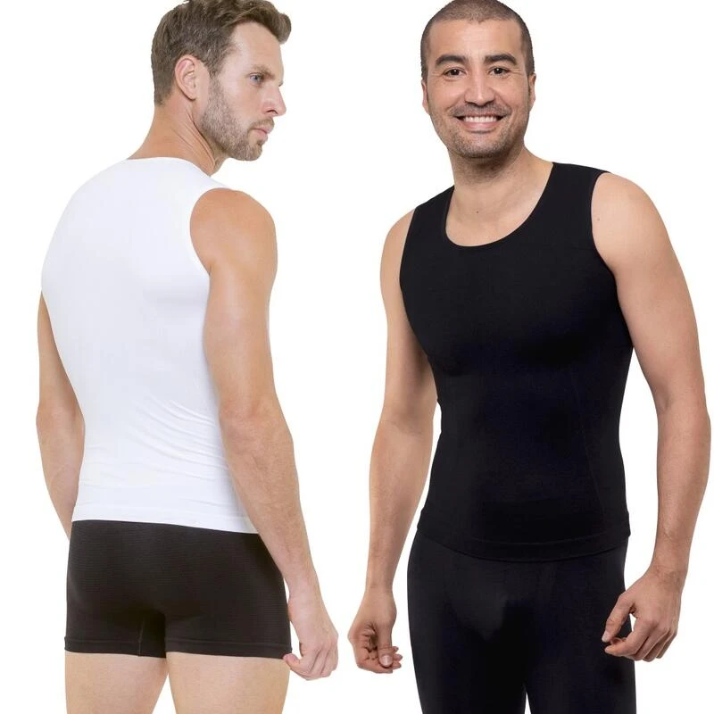 De set van 2 zwart-witte Cellutex verfijnende tanktops voor heren zijn technische kledingstukken met een groot draagcomfort die afslankende en omhullende efficiëntie combineren.