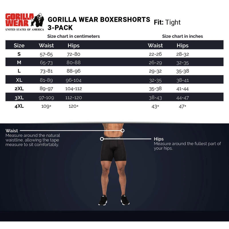 De Gorilla Wear Boxershorts zijn perfect om onder je workout outfit te dragen of onder je spijkerbroek. De Gorilla Wear Boxershorts zijn heel comfortabel vanwege de hoge kwaliteit materiaal. De elastische taille zorgt voor de perfecte fit. Deze boxershorts komen in een verpakking van drie, met drie verschillende soorten taille banden; grijs, rood en wit. Koop die van jou nu
